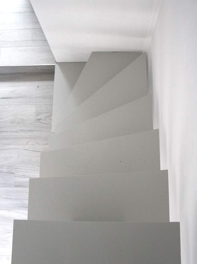 Marches et limons en acier découpés laser 10mm, marches et limons thermolaqués gris RAL 7044 et blanc RAL 9003 structuré.